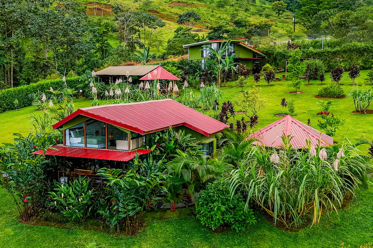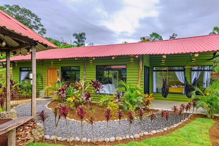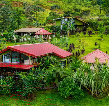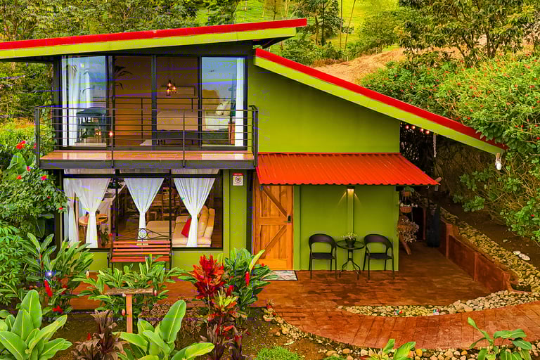 Escape to the serenity of the rainforest and indulge in a true Costa Rican experience at our beautiful mountain cabins. Nestled on a lush mountainside adjacent to the rainforest, our spacious cabins are designed to make you feel right at home. Surrounded by vibrant gardens and boasting panoramic glass windows, our cabins offer a warm embrace from nature.