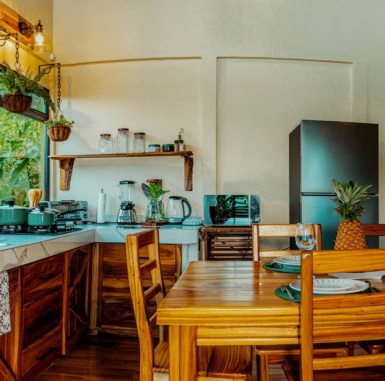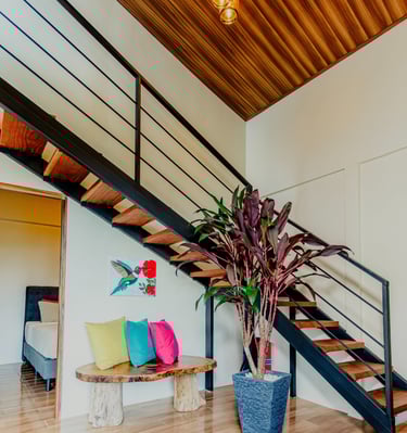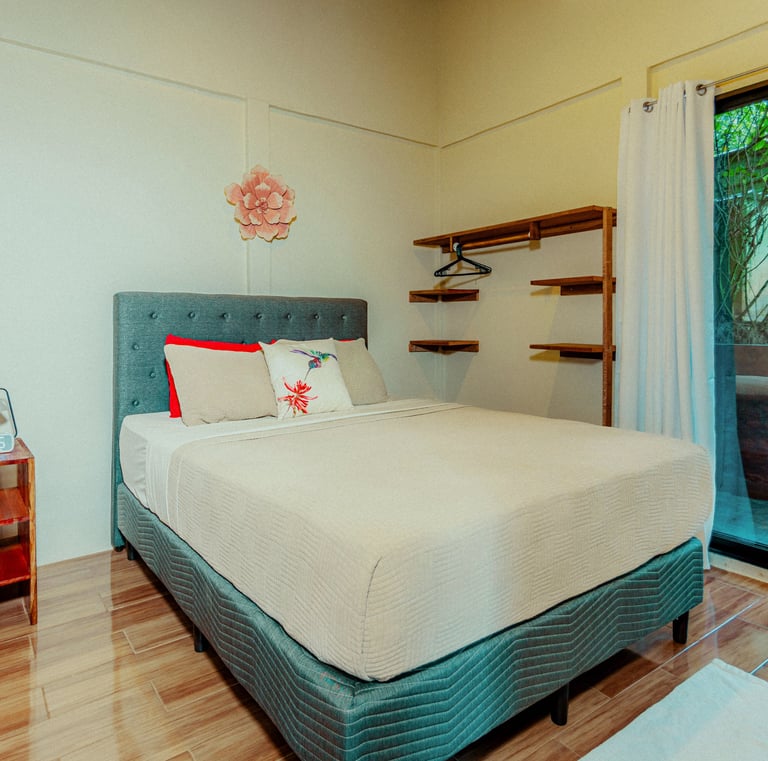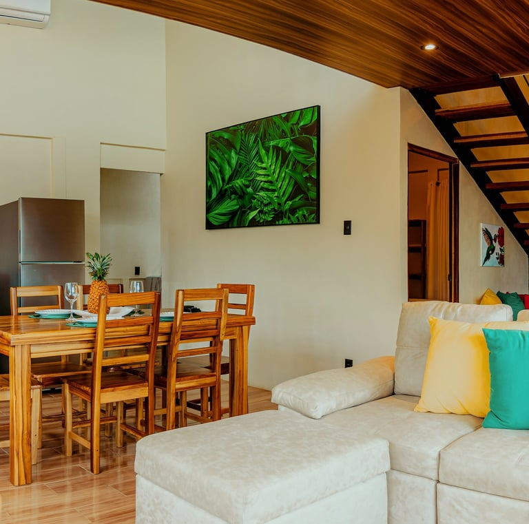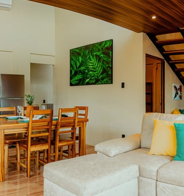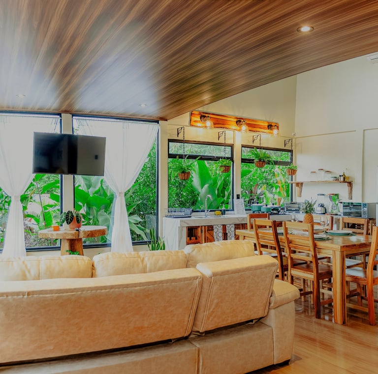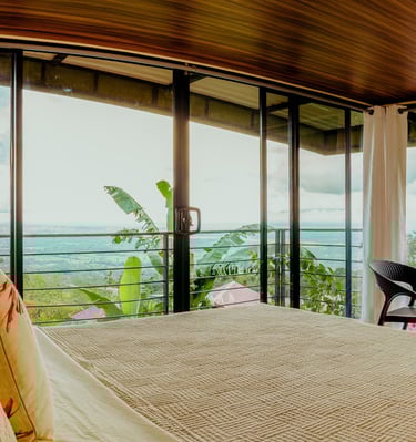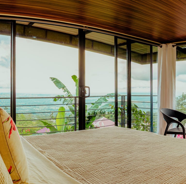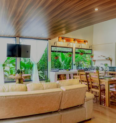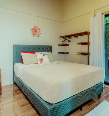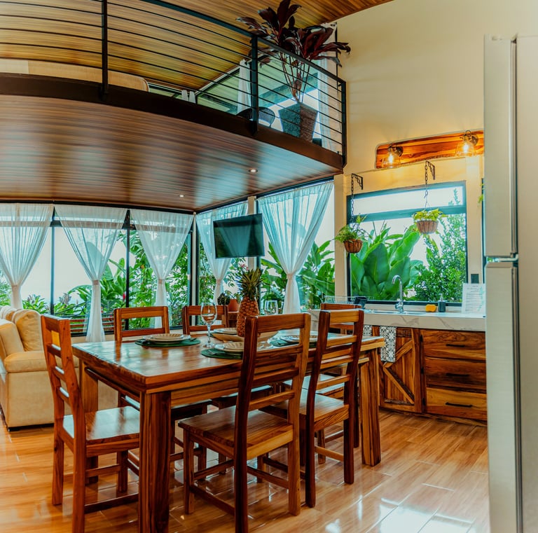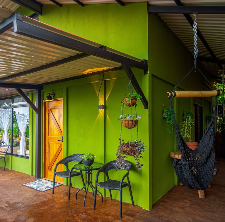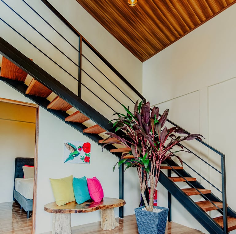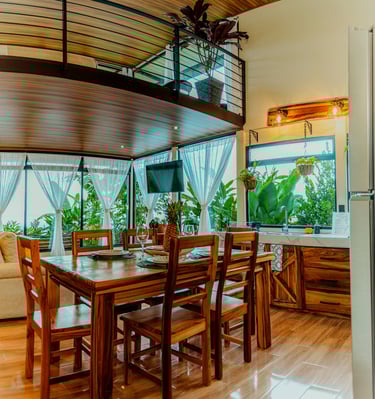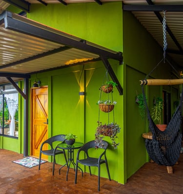 “El Colibri” Hummingbird Cabin: A New Addition to Our Property. Inspired by an area on our grounds frequented by hummingbirds, the Hummingbird Cabin offers a unique and elevated experience. Perched higher on our property, it provides an unparalleled panoramic view. Upon entering the cabin, guests are greeted by its impressive ceiling height, a private bedroom with a private patio, and a second-level loft. This loft boasts an exceptional view and a balcony, inviting guests to immerse themselves in nature’s pristine beauty. The cabin harmoniously blends rustic charm with modern comfort, incorporating pops of color to create a visually appealing ambiance. Equipped with a fully equipped kitchen and a spacious dining area, it offers ample space for culinary delights and relaxation. Adjacent to the cabin, our grounds feature manicured gardens, a kilometer-long rainforest hiking trail that leads to a natural spring swim hole, providing a refreshing escape from the beauty of nature.