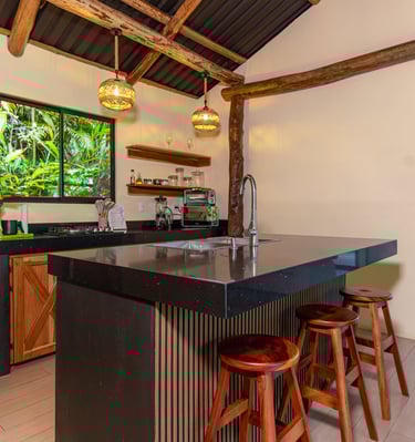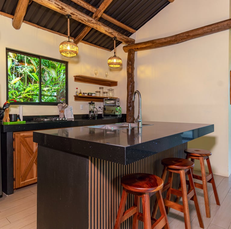 Welcome to El Toucan Cabin, where rustic charm meets modern comfort! Nestled amidst lush rainforest, this picturesque retreat invites you to immerse yourself in tranquility. High ceilings adorned with exposed wood beams create a cozy ambiance, while large windows frame breathtaking cityscape views, connecting you with nature's beauty. Carefully curated modern decor enhances the space, offering a perfect blend of elegance and relaxation. The spacious kitchen, complete with a charming garden window, is ideal for culinary adventures and family gatherings.